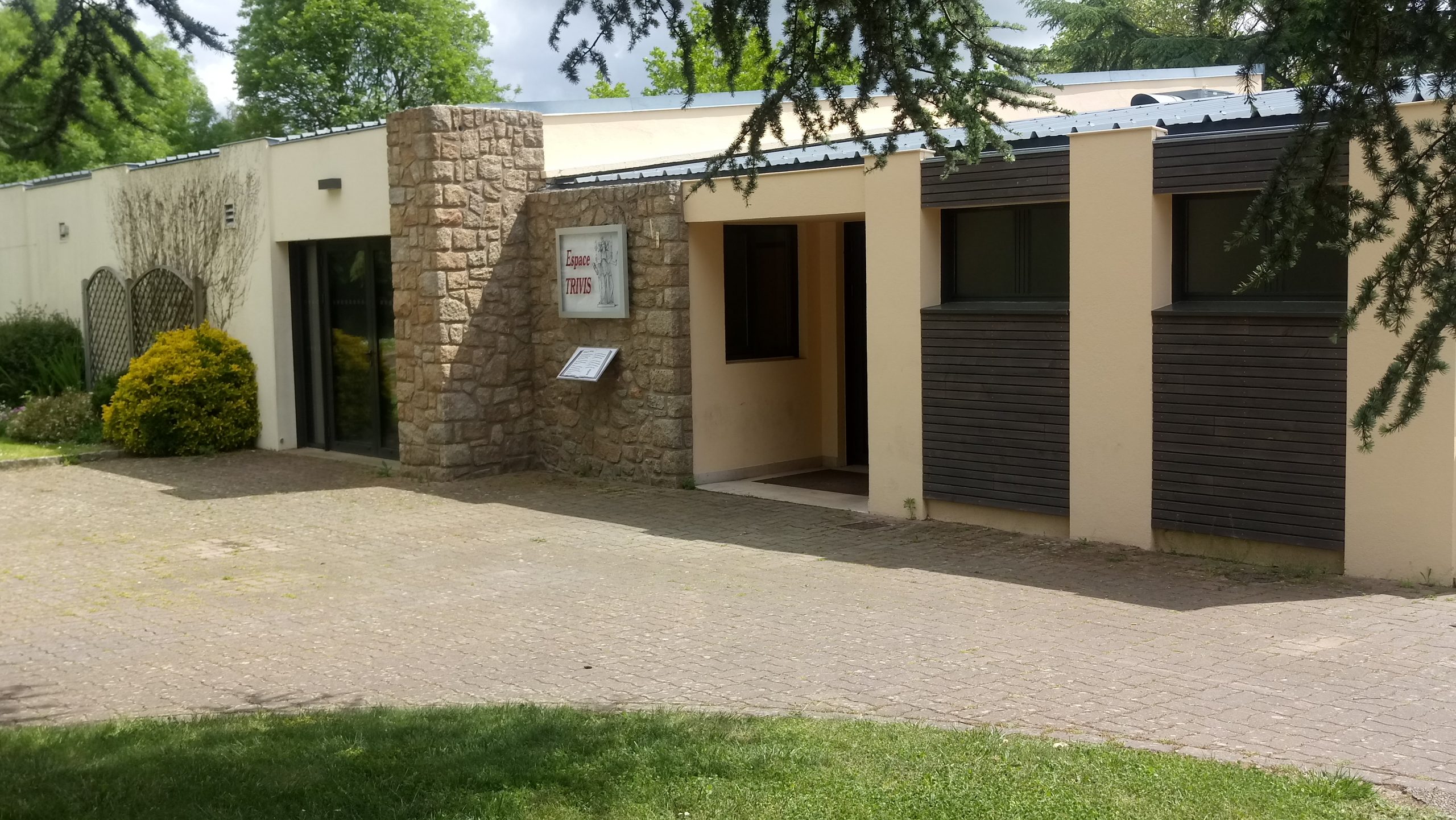 Son extension octroie un nouvel espace largement ouvert sur le parc attenant. De conception simple en ossature bois avec une couverture monopente, ce volume apporte un caractère moderne à la salle, avec un rappel du bardage de l'extension sur les façade existante.